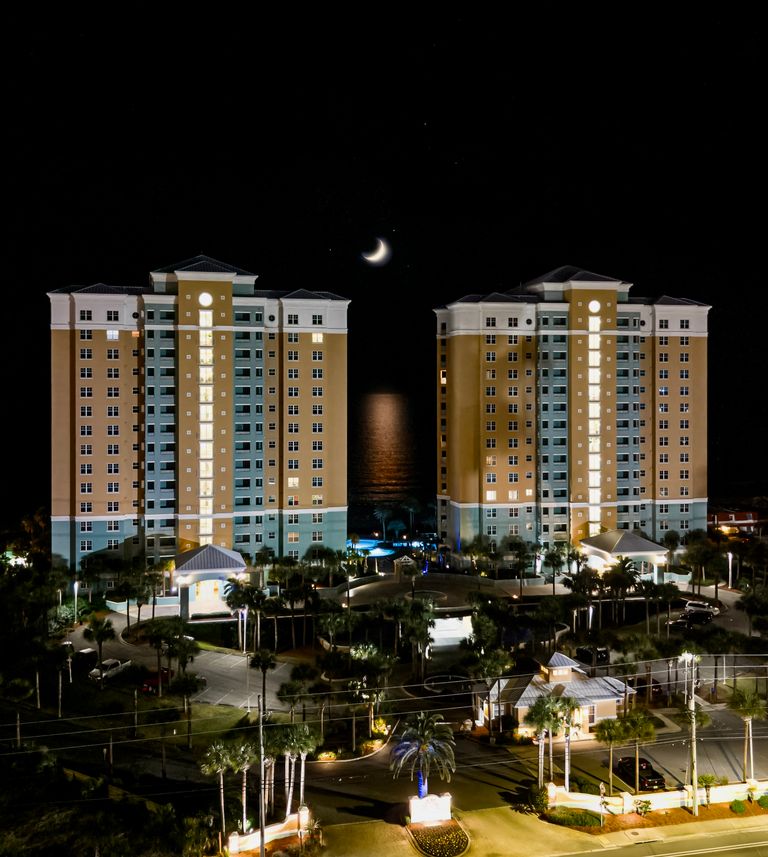 photoreal estateresidential complexapartment buildingsnighttime photographycrescent moonwaterfrontpalm treescoastal architectureilluminated facademulti-story buildingflorida panhandlemodern constructionlandscape lightingbeige and blue exteriorluxury developmentresort-style amenitiesen soleil